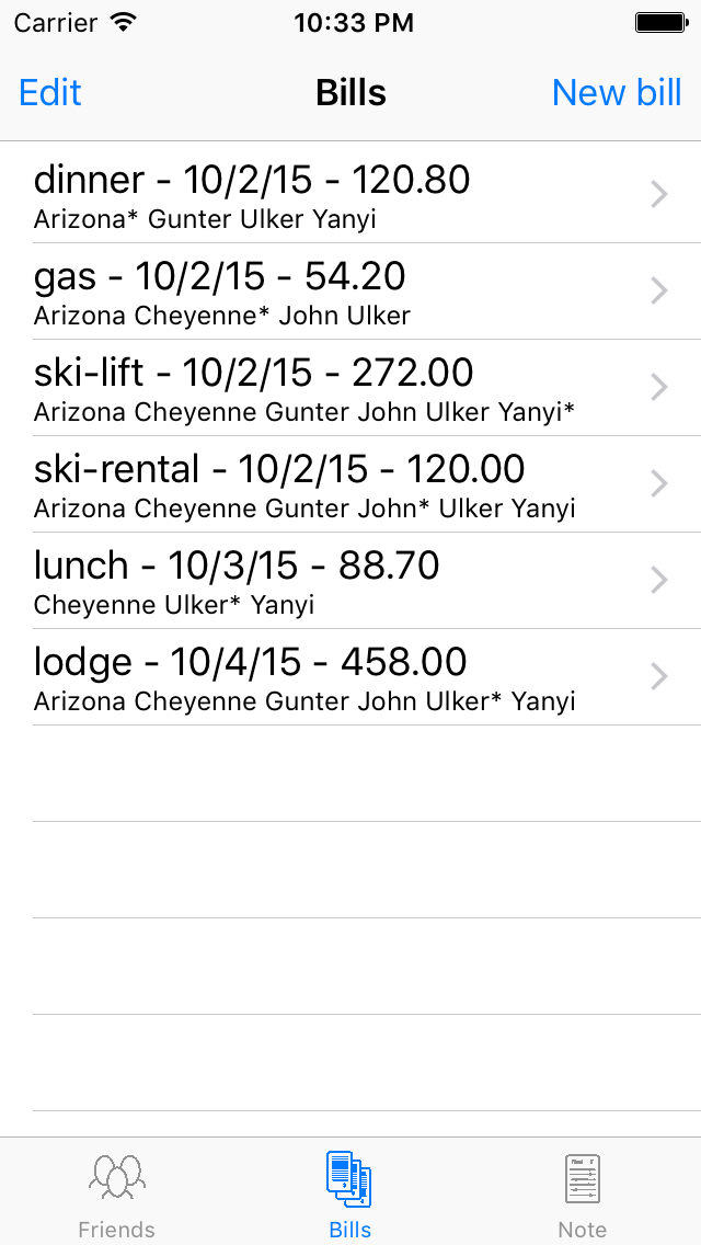 After first adding some Friends it is time to enter the Bills once you received and paid them. To do this press the New Bill button on this screen and enter the Bill information on the Bill Detail screen.