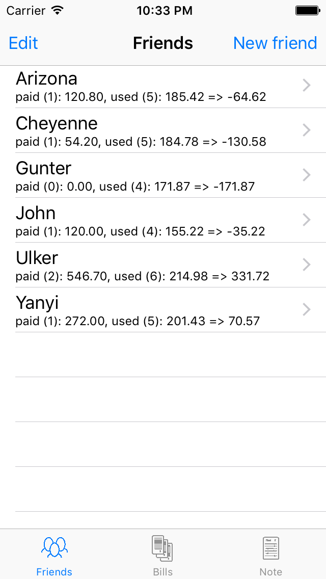 Consider Cheyenne in the example above. She did pay one Bill for the amount of 54.20 and she participated consuming in 5 Bills for a total amount of 184.78. So, at the moment she is 130.58 in debt. If you want to know the details just press the detail-sign (>) to navigate to the Friend detail screen.
